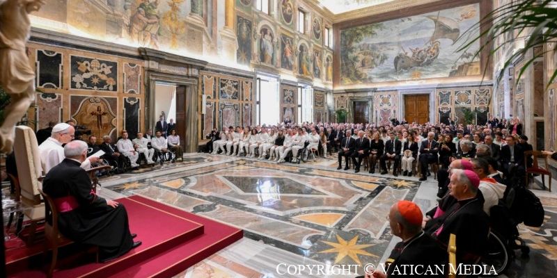 Dragi sportivi, vă mulțumesc tuturor pentru angajarea voastră. Mă rog ca Isus Cristos, „adevăratul atlet al lui Dumnezeu” (cf. Sfântul Ioan Paul al II-lea, Omilie pentru Jubileul Sportivilor, 29 octombrie 2000, 4), să vă inspire pe fiecare dintre voi la provocări din ce în ce mai virtuoase și să vă dăruiască forța pentru a le trăi cu pasiune. În timp ce vă însoțesc cu binecuvântarea mea, vă încredințez o misiune: să continuați să faceți în așa fel încât persoana să rămână în centrul sportului în toate exprimările sale (cf. Scrisoarea Viața din belșug).