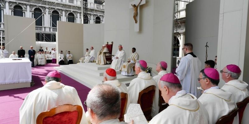 Iubiți frați și surori, acesta este rodul pe care suntem chemați să-l aducem în viața noastră, în relațiile noastre, în locurile pe care le frecventăm în fiecare zi, în societatea noastră, în munca noastră. Dacă astăzi privim la acest oraș Veneția, admirăm frumusețea sa încântătoare, dar suntem preocupați și pentru atâtea problematici care îl amenință: schimbările climatice, care au un impact asupra apelor din Lagună și asupra teritoriului; fragilitatea construcțiilor, a bunurilor culturale, dar și cea a persoanelor; dificultatea de a crea un ambient care să fie pe măsura omului printr-o gestionare adecvată a turismului; și în afară de asta, tot ceea ce aceste realități riscă să genereze în termeni de relații sociale destrămate, de individualism și singurătate.